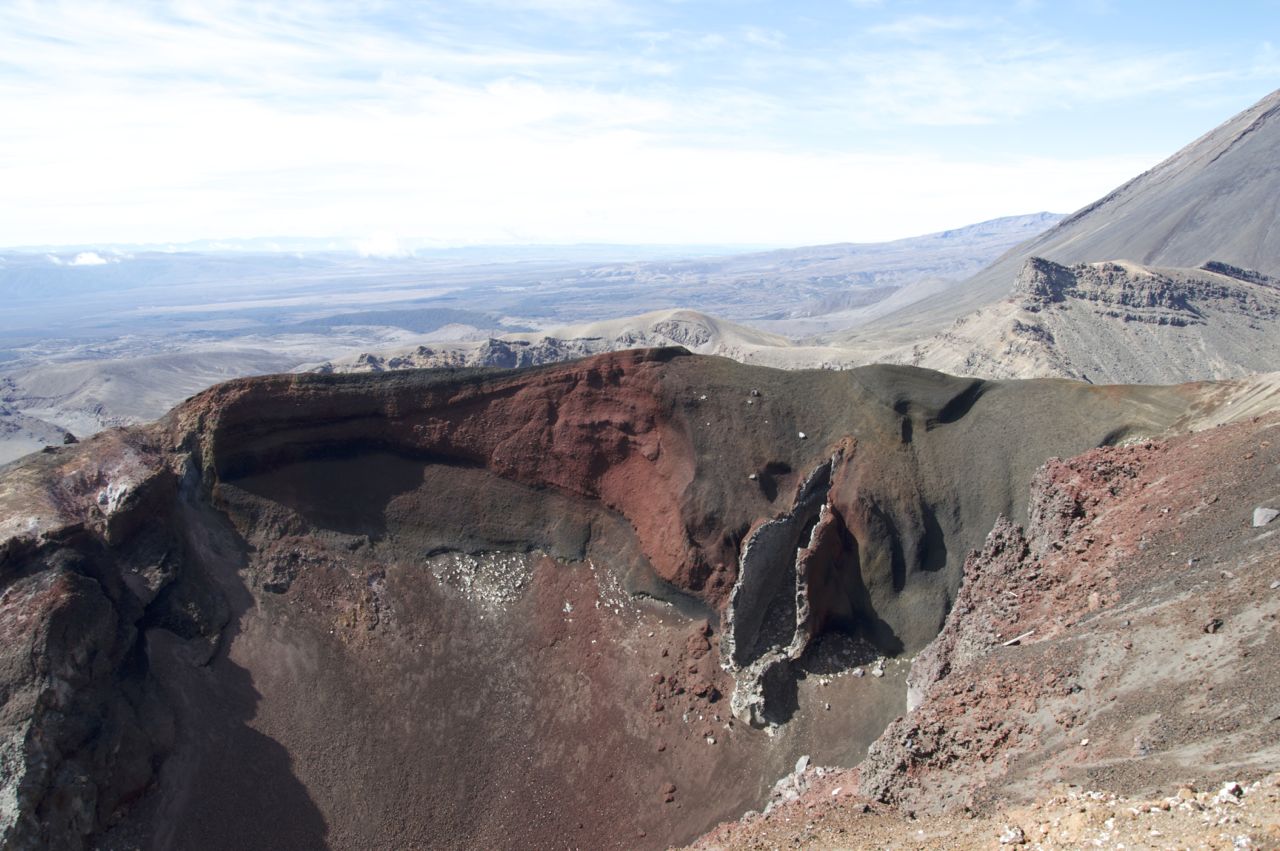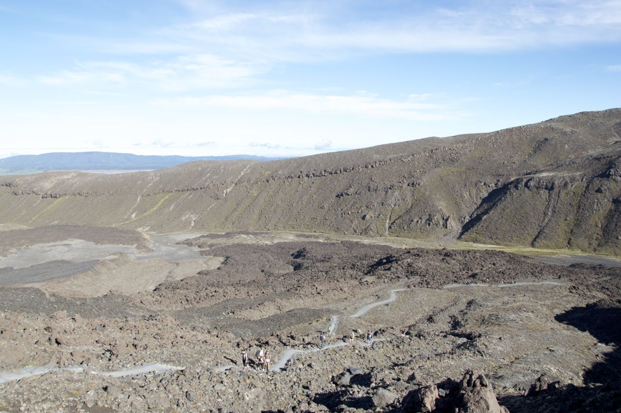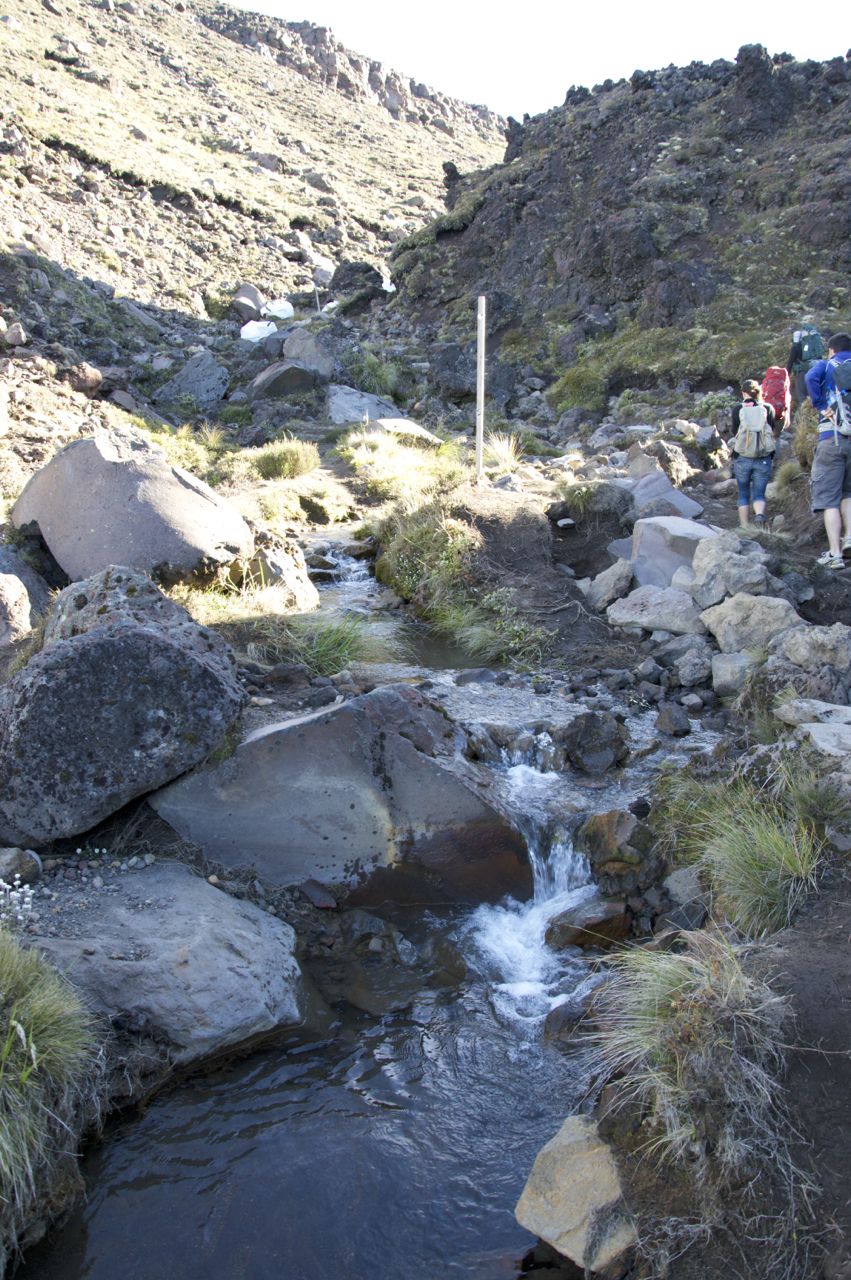 der erste leichte anstieg erfolgte grösstenteils im schatten und der kühle wind liess uns nur spährlich auf betriebstemperatur kommen. nach ca. 3 kilometern kam, wie angekündigt, die erste und zweit letzte toilette des 19 kilometer langen marsches. von da aus ging es kontinuierlich und anspruchsvoll bergauf. bis wir um 10:30 uhr den „red crater“ passiert und an einem kleinen idylischen seelein ein picknick lager eingerichtet hatten. gefühlsmässig mussten wir zu diesem zeitpunkt schon die hälfte erreicht haben. doch die realität bzw. unsere landkarte sagte uns etwas anderes. wir waren noch ein gutes stück davon entfernt.