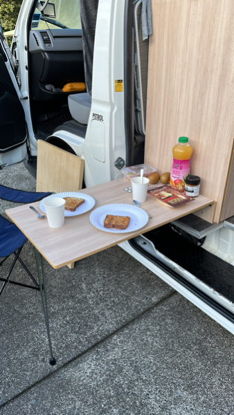 Der blaue Himmel und die Sonne laden zum frühen Aufstehen ein. Der Camper hat seitlich in/an der Küchenkombi einen Klapptisch, welcher uns nun sehr entgegenkommt. Und natürlich ist der Camper so parkiert/eingerichtet, dass die Morgensonne genau auf unseren Frühstücksplatz scheint. Herrlich, das ist ein Start in die neue Woche!