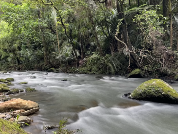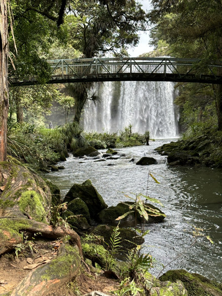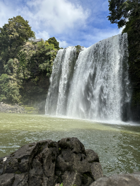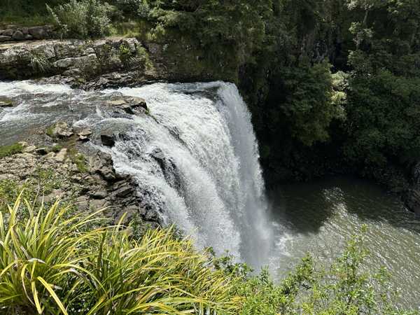 Der bislang eher ruhige Fluss wird etwas rauher und Felsbrocken lassen Stromschnellen entstehen. Unser Ziel naht, der Whangarei Fall. Der Wasserfall ist Teil des Flusses Hatea, welchem wir anderhalb Stunden gefolgt sind. Unser Fussweg führt zur unteren Seite des Wasserfalls. Noch selten habe ich einen so imposanten und mächtigen Wasserfall gesehen. Der sich unten gebildete See mit Ablauf würde eigentlich zum Baden einladen. Aber A: ich weiss nicht wie kalt das Wasser ist und B: das Wasser ist eher bräunlich, was wohl auf die Regenfälle der letzten Tage zurückzuführen ist.