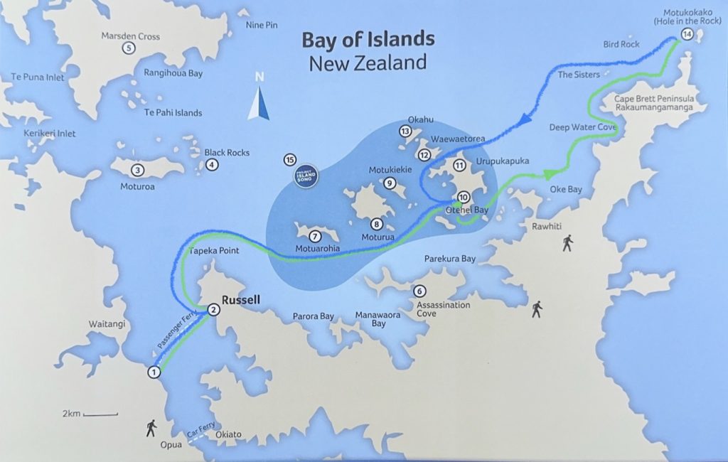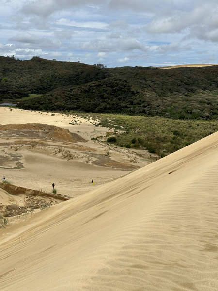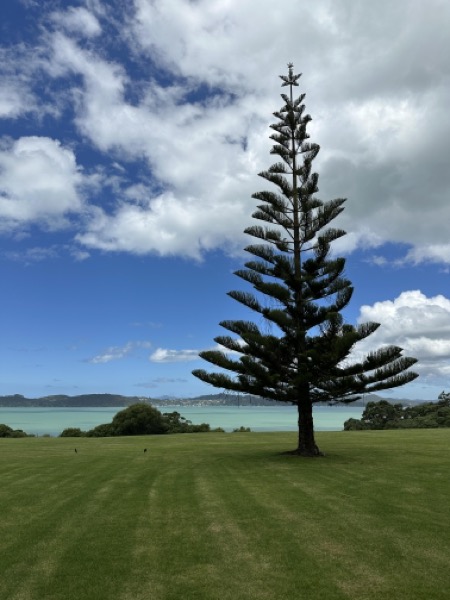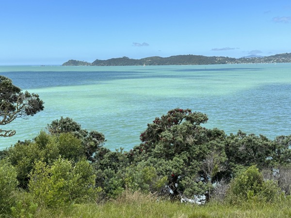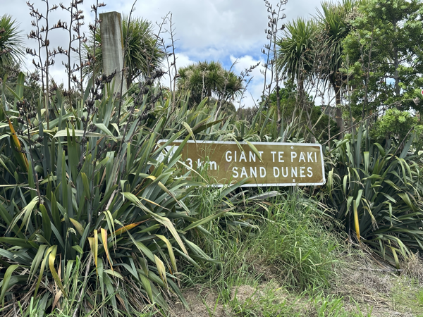 Unterwegs verlassen wir für etwa einen Kilometer die tropische Umgebung und folgen einer Strasse. Die Sonne bratet auf unsere geschützten Häupter und lässt uns zusätzlich von unseren Reserven zerren. Nach diesem leicht ansteigenden Teilstück führt uns der Weg wieder in den Wald. Die Ein- und Ausgänge der Waldpfade sind mit Schuhreinigungsstationen ausgerüstet. Es soll verhindert werden, dass die mächtigen Kauri Bäume durch Schädlinge in Mitleidenschaft gezogen werden.