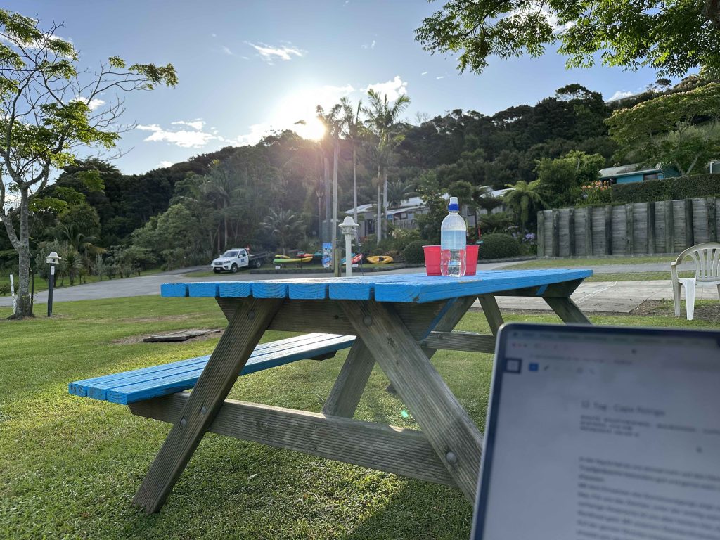 Der blaue Himmel und die Sonne laden zum frühen Aufstehen ein. Der Camper hat seitlich in/an der Küchenkombi einen Klapptisch, welcher uns nun sehr entgegenkommt. Und natürlich ist der Camper so parkiert/eingerichtet, dass die Morgensonne genau auf unseren Frühstücksplatz scheint. Herrlich, das ist ein Start in die neue Woche!