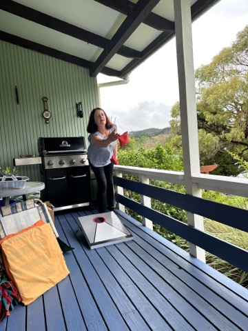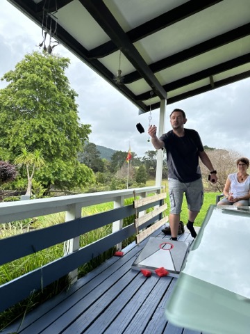 Nach dem Essen werden wir zu „Cornhole“ eingeladen. Es ist ein Spiel, welches zu zweit oder zu viert gespielt wird. Kleine Sandsäckchen müssen durch das Loch im Holzbrett geworfen werden. Das Brett ist leicht geneigt und etwa in 5 Meter Entfernung. Wenn das Säckchen durch das Loch geworfen wird, gibt es frei Punkte. Wenn das Säckchen auf dem Brett zu liegen kommt, gibt es einen Punkt. Kommt das Säckchen neben dem Brett zu liegen, gibt es keinen Punkt. Gespielt wird gegeneinander und die Punkte pro Wurfdurchgang mit jeweils 4 Säckchen werden gegeneinander saldiert. Das Team oder der Spieler, welcher zuerst 21 Punkte erreicht, hat gewonnen. Das Spiel macht riesigen Spass und wir haben in fast allen möglichen Konstellationen gegen- bzw. miteinander gespielt. So haben mindestens alle einmal gewonnen!