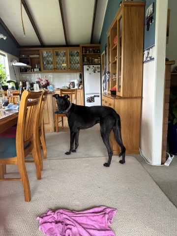 Trotz seiner Grösse ist Denzel einer der liebsten Hunde, welchen ich je gesehen habe. Denzel ist 6 Jahre alt und war ursprünglich ein Rennhund. Er wurde wegen „fehlendem“ Erfolg in Rente geführt. Er gewann in 17 Rennen nur eines. Diese Rennhunde werden in NZ sehr gut behandelt und geniessen beste Versorgung. Dies gilt auch in der Zeit nach dem aktiven Hochleistungssport. Sie werden nur an auserwählte Hundehalter vermittelt.