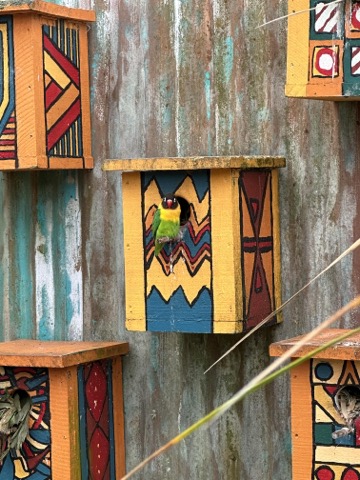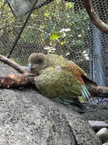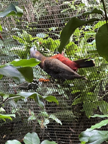 Besonders unterhaltsam, wie sollte es anders sein, sind die Orang-Utans. Es gibt einen Käfig mit einem jungen „Schnüggel“ und eine Freiluft-Anlage, welche mit dicken Seilen überspannt ist. Diese Seile bieten den Affen einen Ausflug in luftiger Höhe, welche sie offenbar nutzen und geniessen. Aber da war auch noch ein quirliger Vogel, der seinem Weibchen imponieren wollte. Mit Erfolg? Wir wissen es nicht!