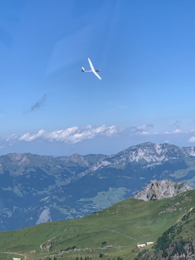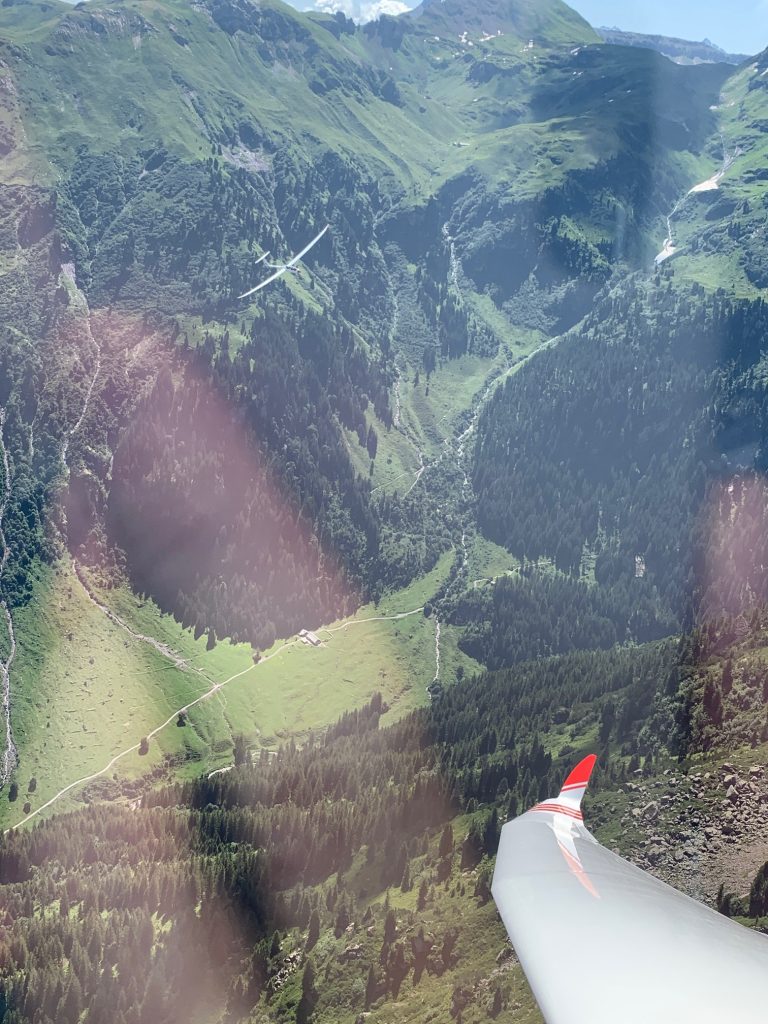 Der Weg führt uns über den Talrand der Linthebene in gebiergiges Gelände, wo wir uns nahe einer Felswand auf die Lauer nach Thermik machen. Die Sonne brennt von oben auf das Cockpit und der Lufteinlass kühlt punktuell nur die anvisierte Stelle am Oberkörper.