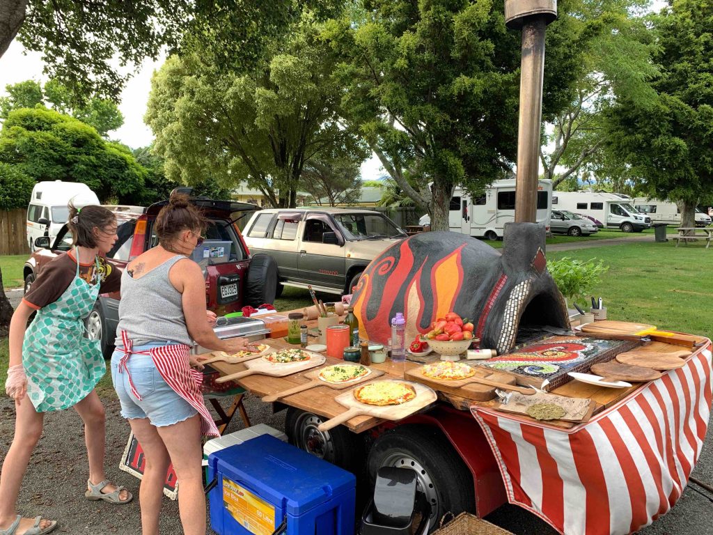 Die Sonne scheint heute den ganzen Tag bis jetzt, wo ein zügiger Wind aufzieht und den Himmel mit den bekannten weissen „Dampfkissen“ verhängt. Wir sitzen unbeeindruckt vor unserem Van auf einer naturbelassenen hölzernen Bank-Tisch-Kombination und genehmigen uns einen Becher feinen roten Wein. Etwas später werden wir wohl den mobilen Holzofenpizzaiolinnen einen Besuch abstatten. Sie haben sich auf dem Campingplatz in der Nähe von uns eingerichtet und verkaufen von 05:00 bis 08:15 Uhr ofenfrische Pizzas. Das lassen wir uns natürlich nicht entgehen…der Wind weht zu allem Übel noch den feinen Pizzaduft ständig zu uns herüber. Zu einem Becher rotem Wein passt das ja hervorragend…:-)
