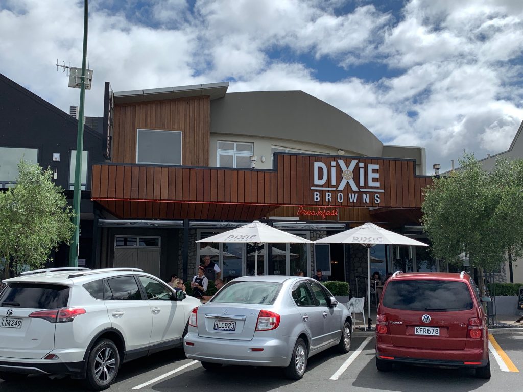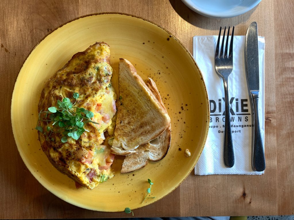 Am der Beach Promenade, unweit von dem Pub vom Vortag, gönnen wir uns einen deftigen Zmorgen. Rosi „dürstet“ es nach Pancake mit Bacon, ich lasse mich von Omeletten des Hauses verleiten.