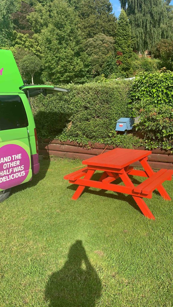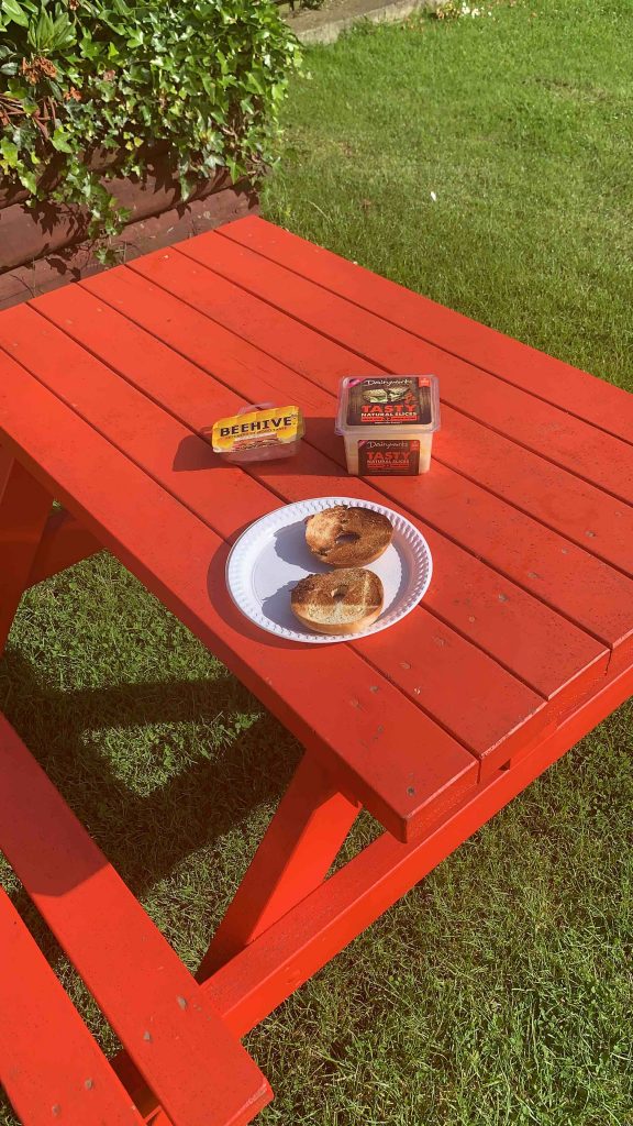 Wir nehmen es gemütlich und frühstücken gepflegt und entspannt an unserer leuchtend orangen Tisch-Bank-Kombination. Diese ist vom Campingplatz-Betreiber zur Verfügung gestellt. Rosi geniesst das frühmorgendliche Sonnenbad, mir wird es schon langsam zu warm. 🙂