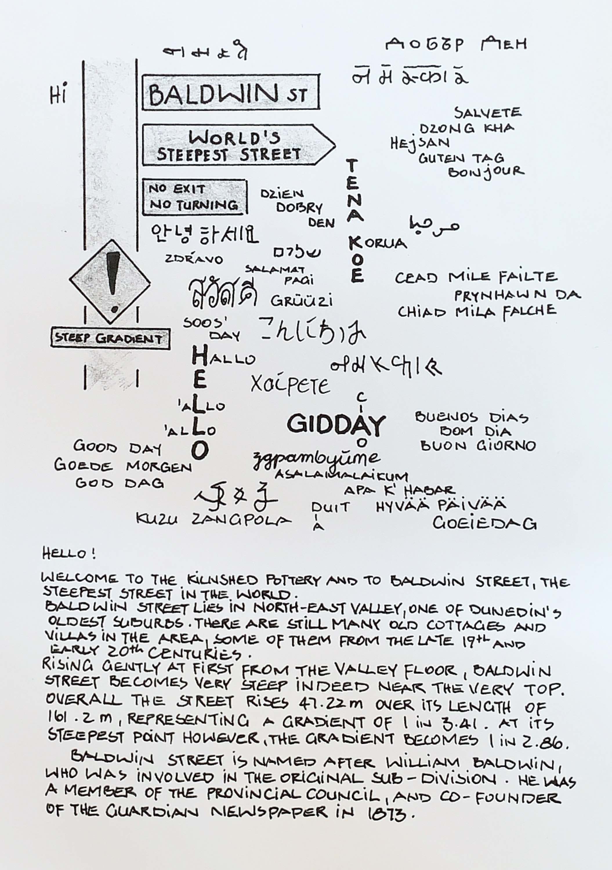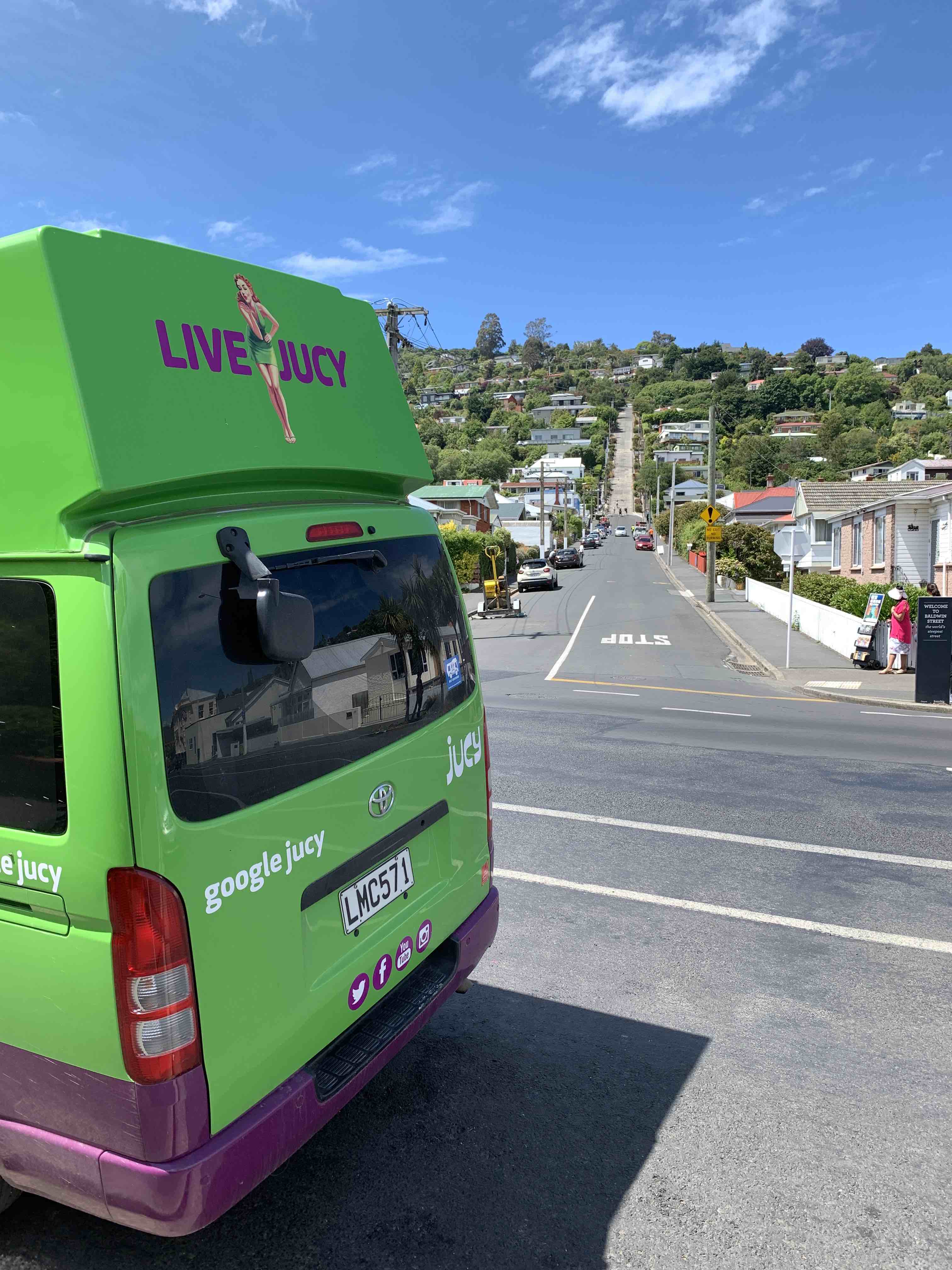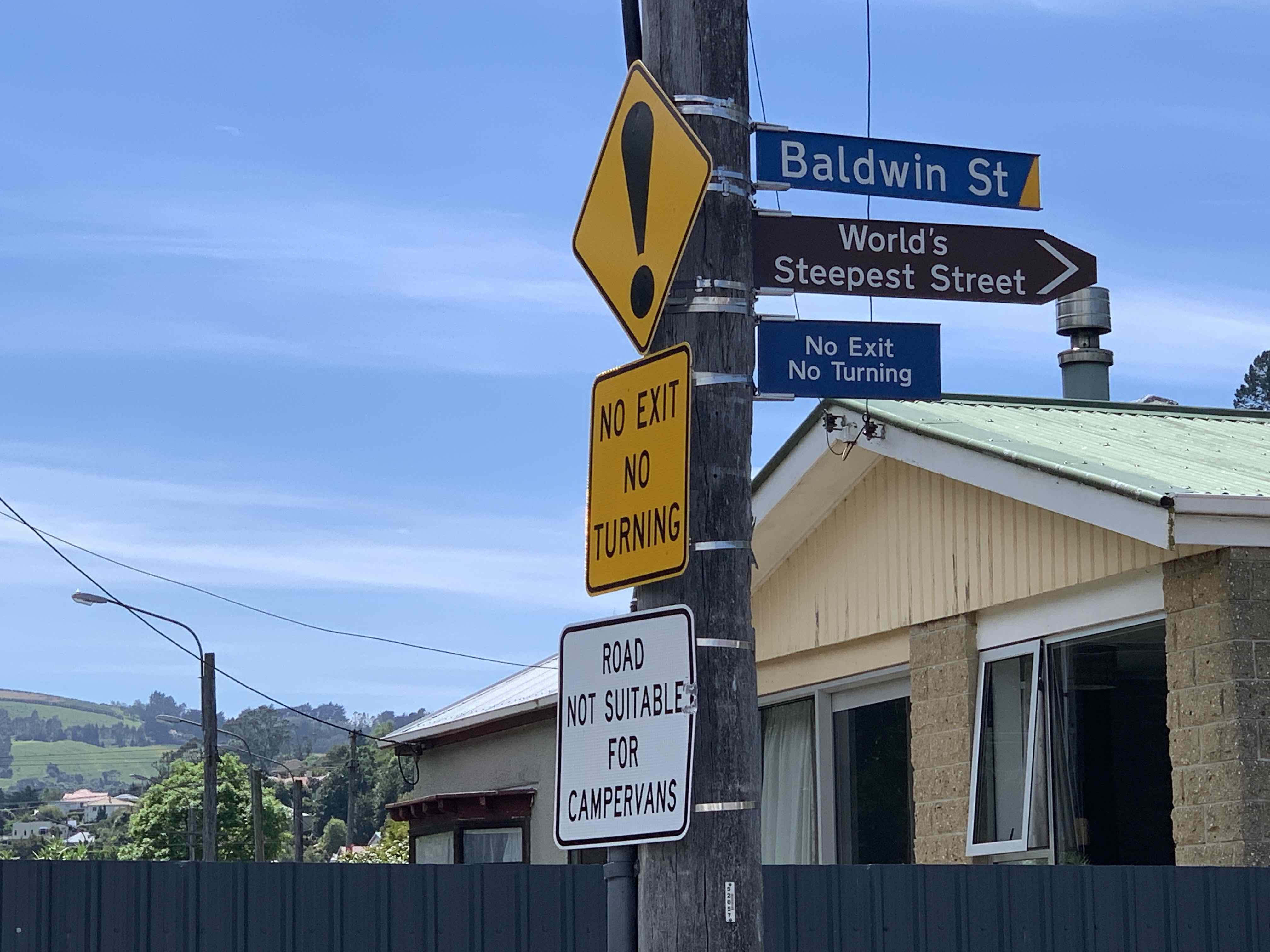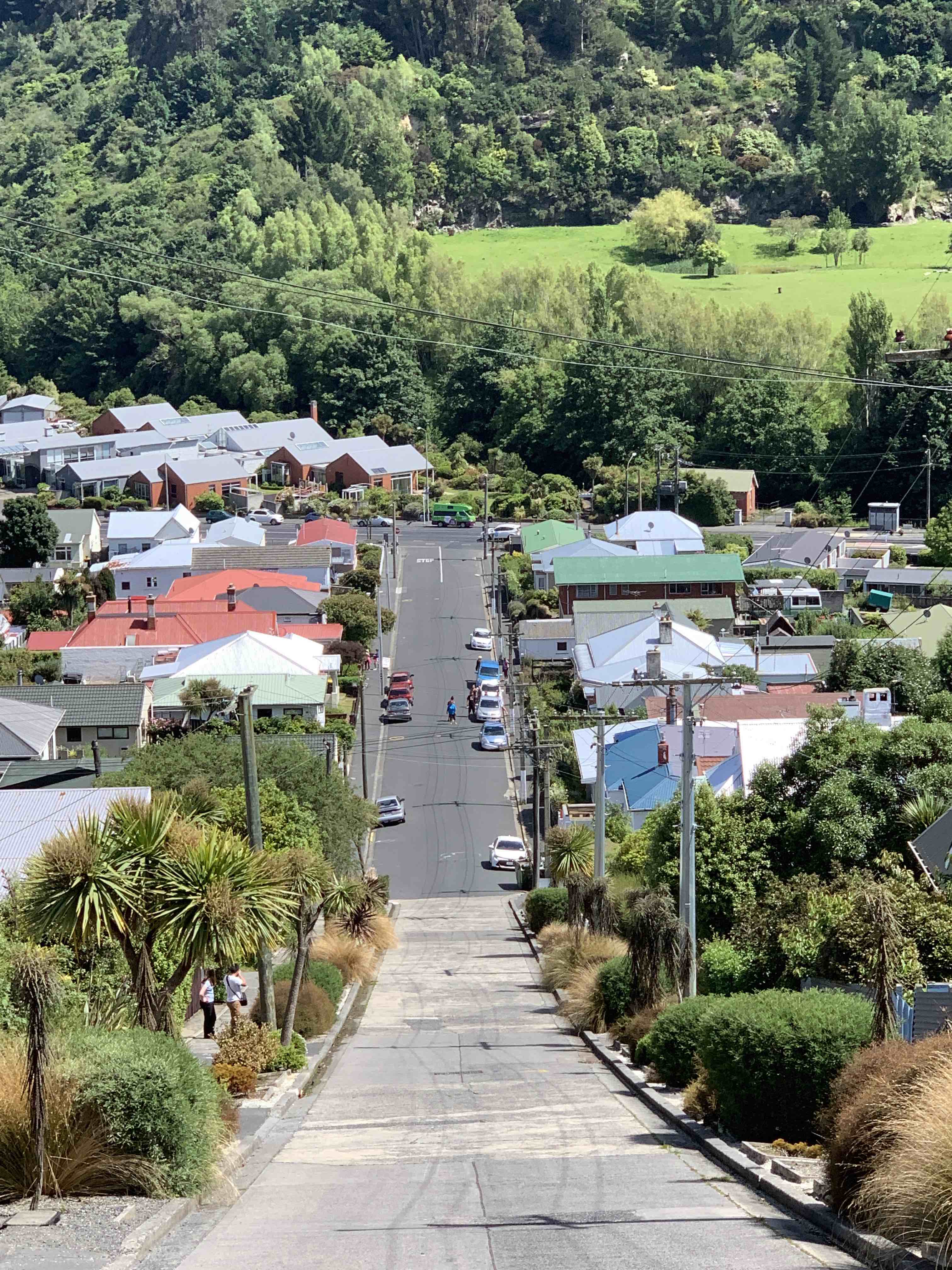 Mit dem Navi ist die Baldwin Street in Dunedin rasch gefunden. Gemäss Guiness Buch der Rekorde ist dies die weltweit steilste Strasse. Mit einem Neigungswinkel von 19 Grad oder einem Verhältnis von 1:2.86 kommt man bei der Begehung der Sackgasse doch ziemlich zum Schnaufen! Wir fotografieren in allen Situationen und Stellungen, um die massive Steigung festzuhalten. Die Strasse ist wegen dem Gefälle übrigens nicht geteert, sondern mit Betonplatten ausgelegt. Der Teer würde dieser Steigung nicht Stand halten. Unterwegs gibt es einen pfiffigen Anwohner, welcher für zwei NZD Zertifikate verkauft. Wir finden das eine tolle Idee und lassen uns die Begehung der wohl weltweit steilsten Strasse „notarisch“ bestätigen.