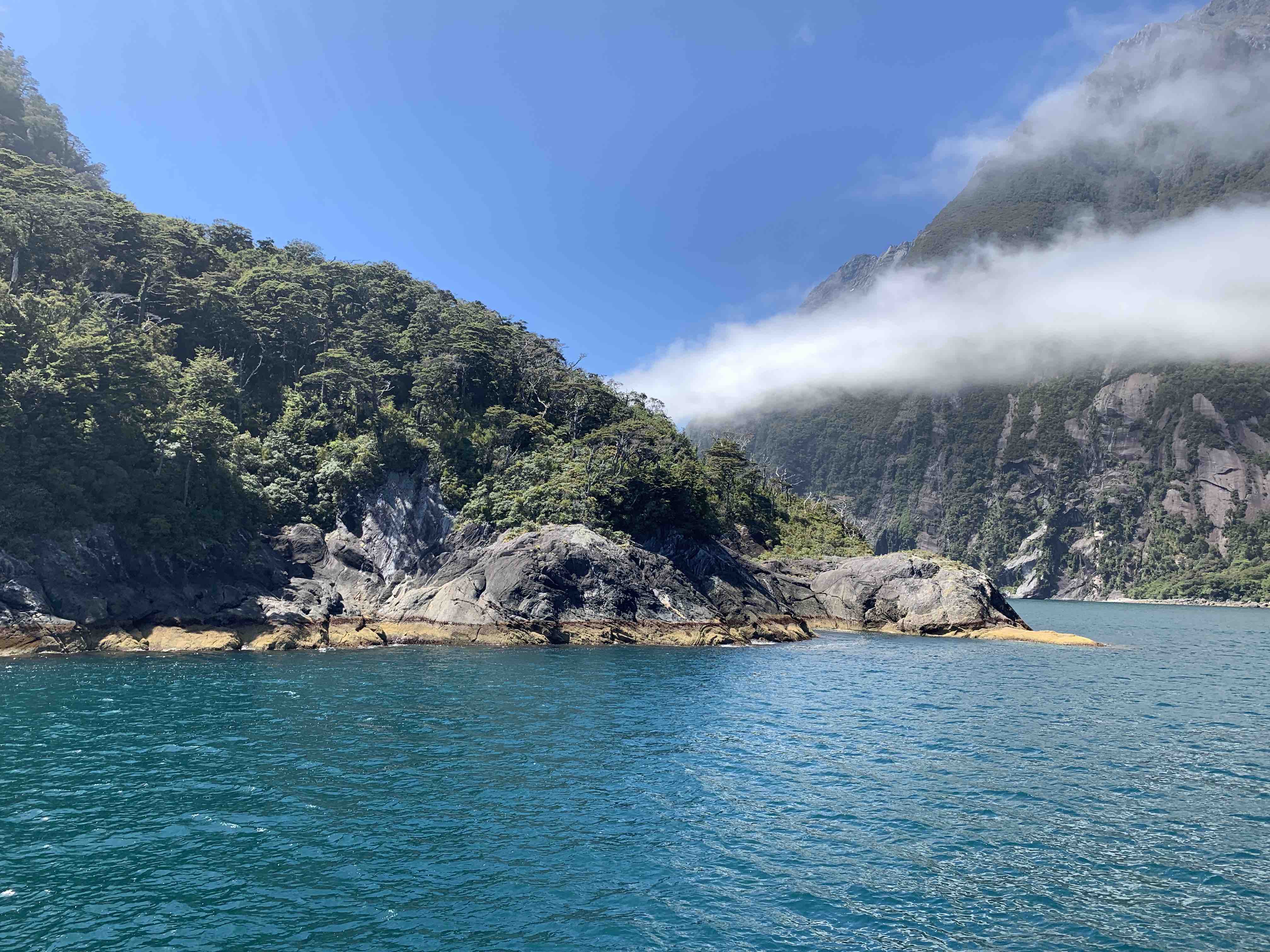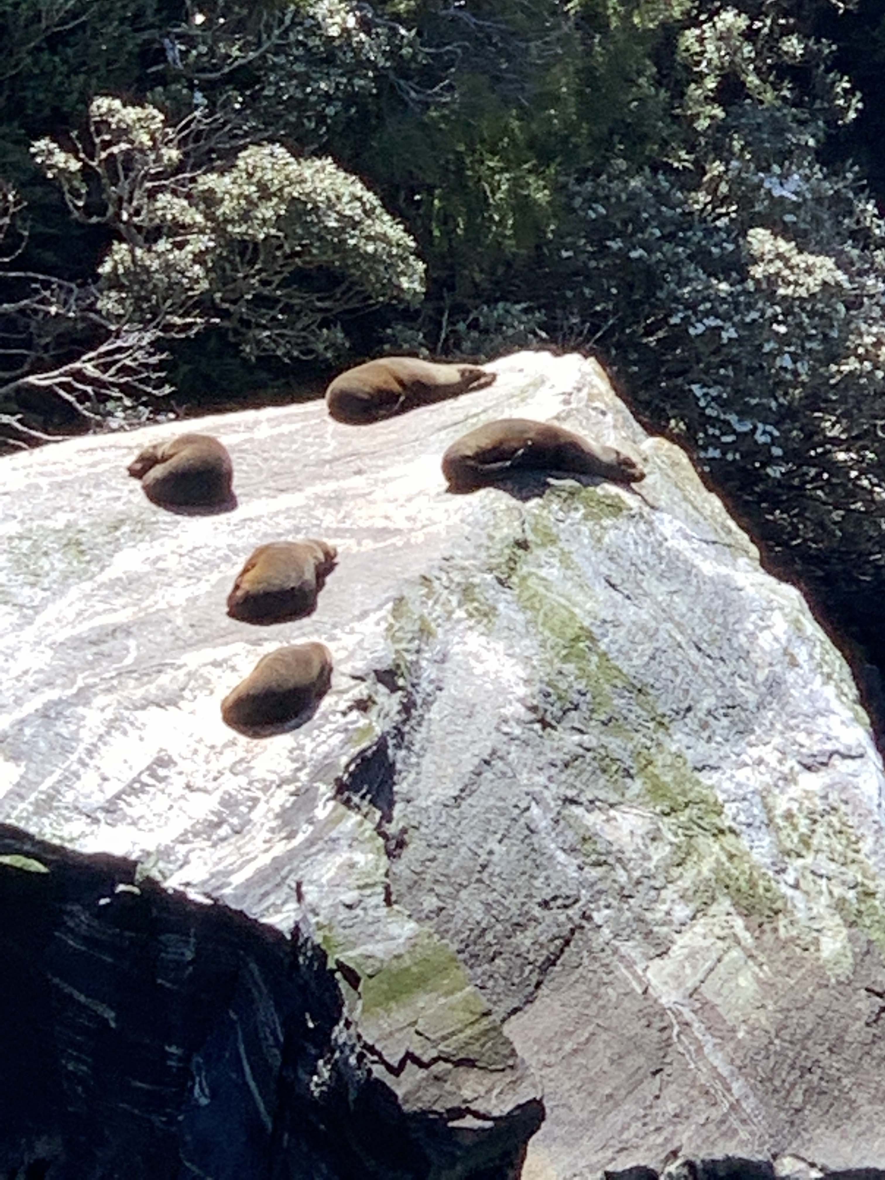 Ok, nun folgt die Bootsfahrt links am Ufer des Fjords entlang bis in die Tasman Sea. Der Rückweg erfolgt an der anderen Fjordseite zurück. Ich bin nicht wirklich überwältigt vom Gesehenen. Trotzdem bietet die Fahrt einige kleine Sehenswürdigkeiten – werden aber als Haupt-Highlights angepriesen – wie Wasserfälle und glücklicherweise auch eine Seehund-Gruppe beim Sonnenbaden.