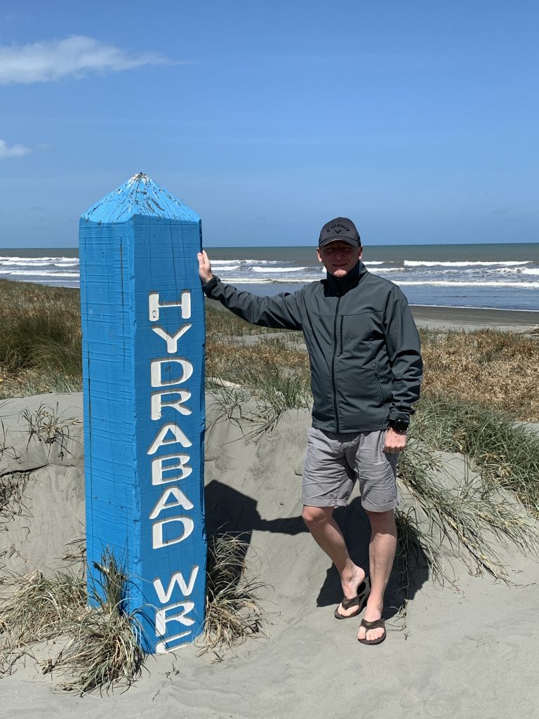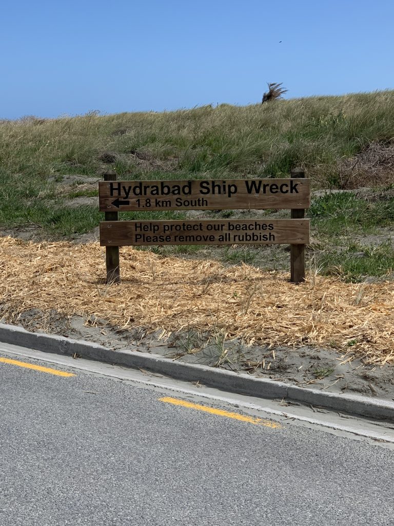 Am besagten Strand in Waitarere sehen wir weit und breit kein Wrack. Wir beschliessen, einige Schritte weiter Richtung Süden zu machen. Da begegnen wir einem Mann mit zwei Hunden. Kurzum erkundigen wir uns nach dem Wrack. Nach kurzem Überlegen erzählt uns der Mann, dass das Fracht- und Passagierschiff 1878 gesunken ist und das Wrack bis ca. 2010 sichtbar war. Seither ist das Wrack vom Sand zugedeckt. Der Standort ist mit einem Gedenkpfosten markiert und ca. 2 Kilometer entfernt.