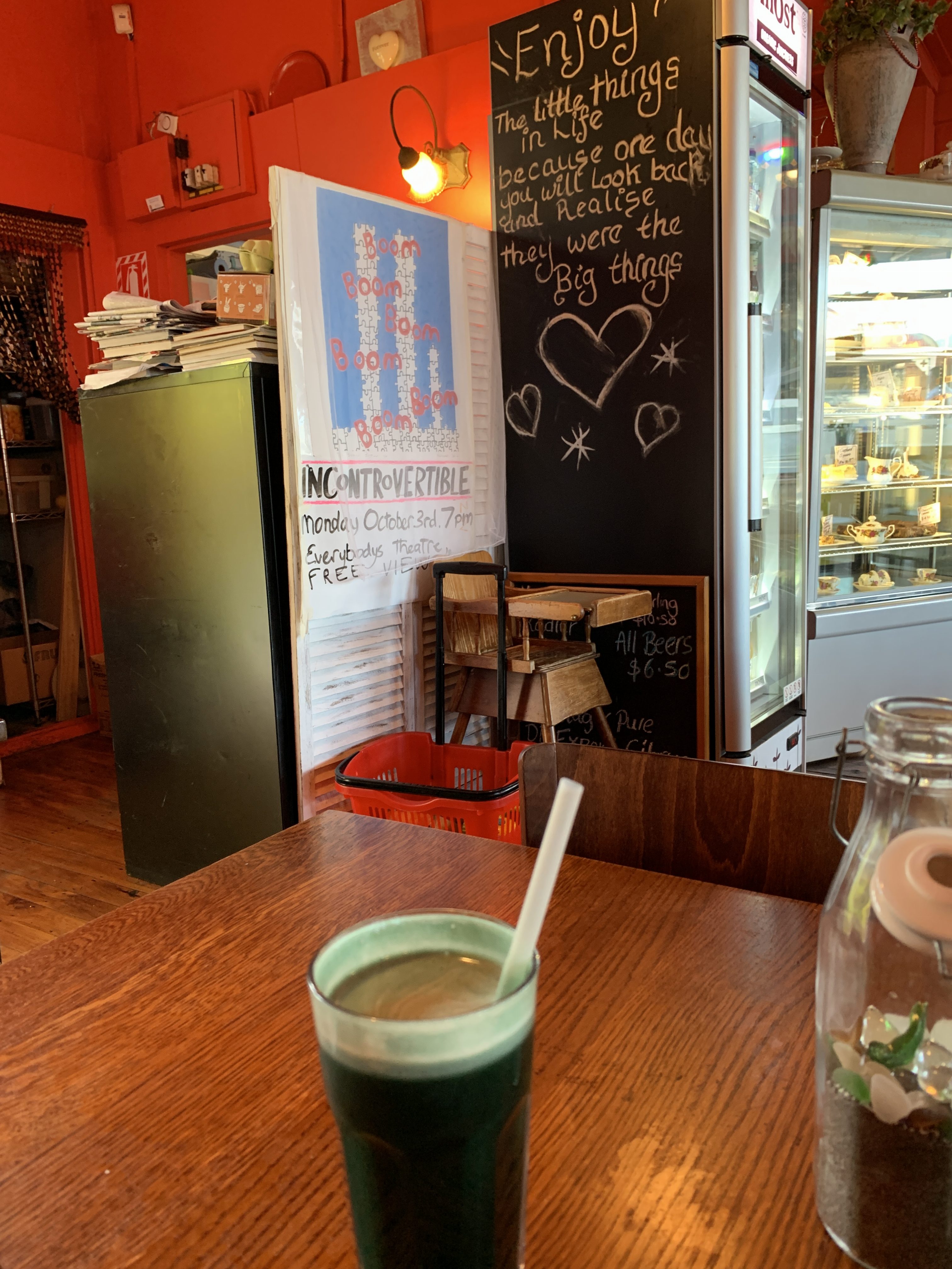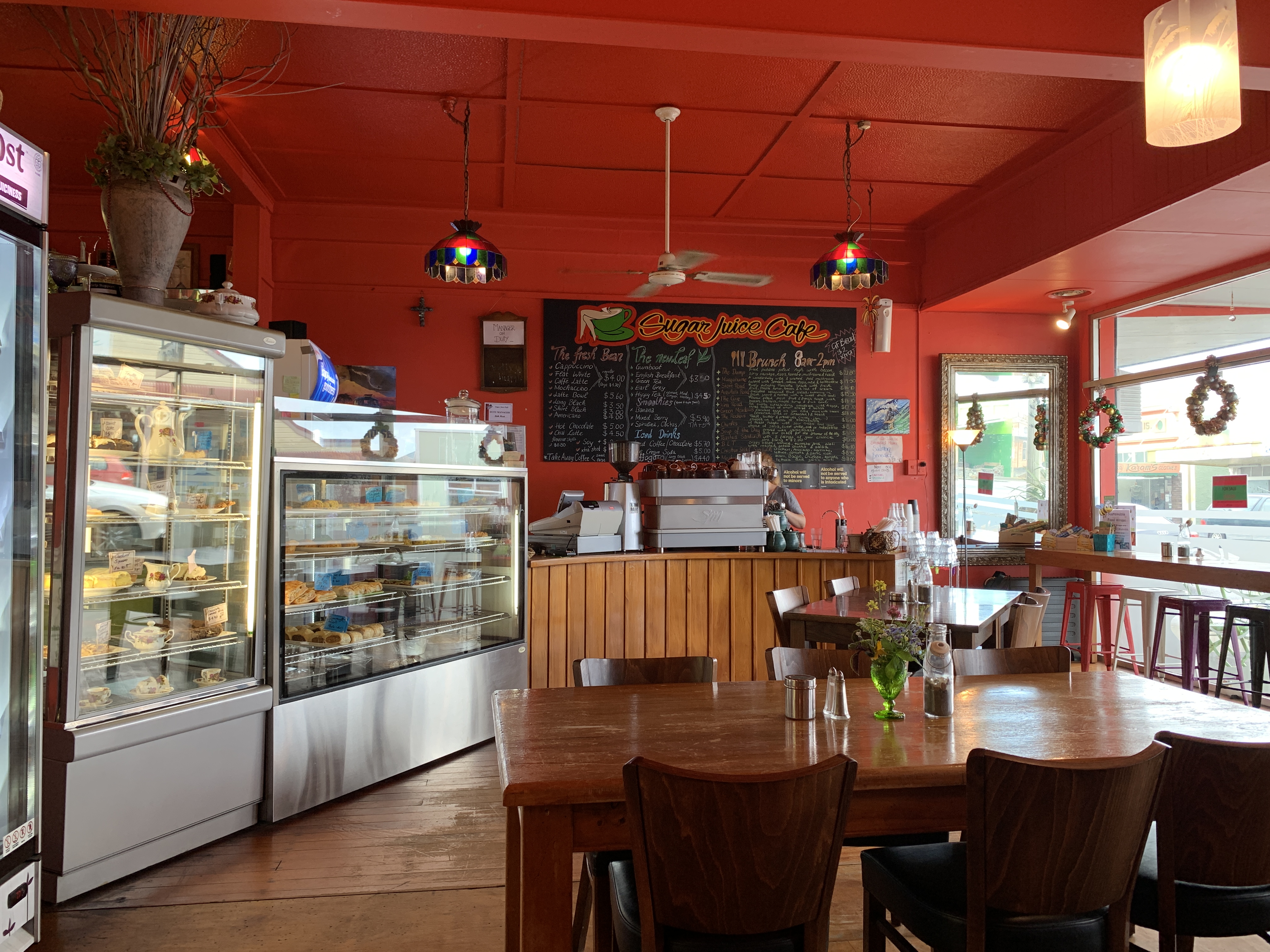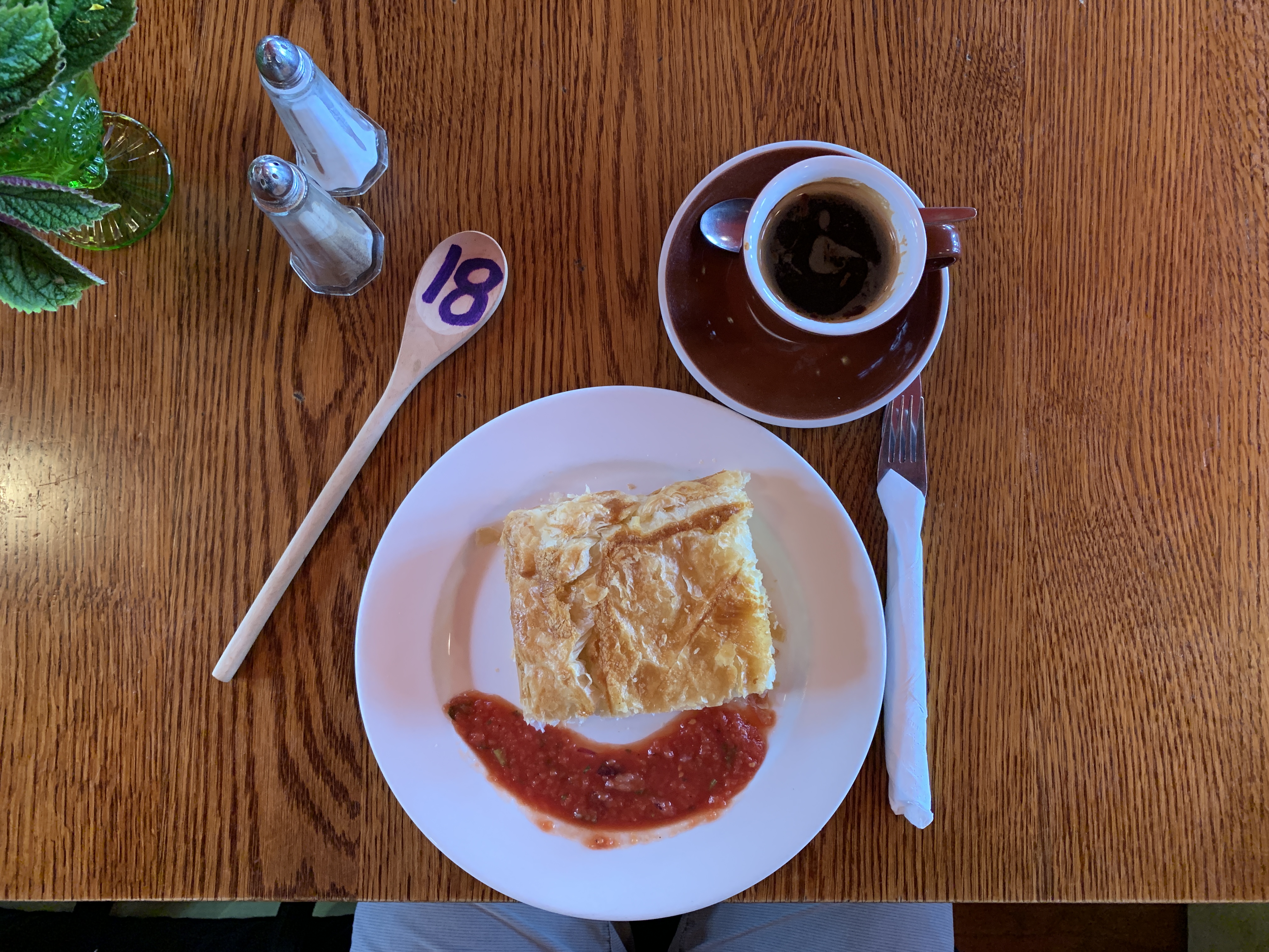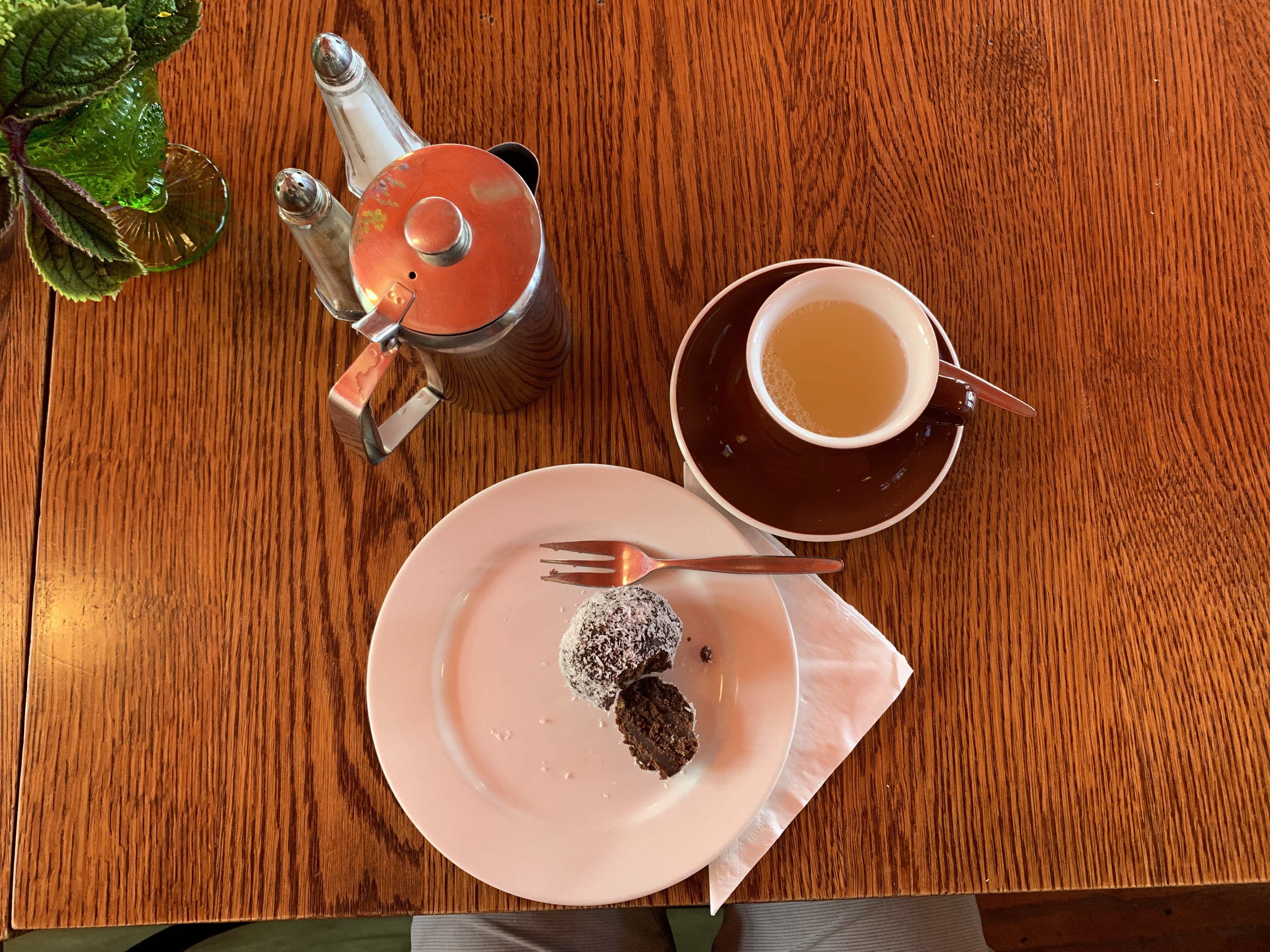 Die Ankunft in Opunake ist vertraut und wir erleben ein déjà-vu. In den 5 Jahren hat sich nicht viel bis gar nichts getan in diesem Schlafkaff. Das einzige Highlight – zumindest unseres – ist das vorher erwähnte Lokal. Rosi bestellt einen blueberry & Lemon Maffen, ich mein Standard Menü Bacon & Egg Pie. Dazu gibt es Kaffee und zur besseren Abrundung einen Cactus-Smoothie und einen Hippie Tea mit einer Schoggi-Truffes-Kugel. Mmmmh, es war einmal mehr sehr lecker.