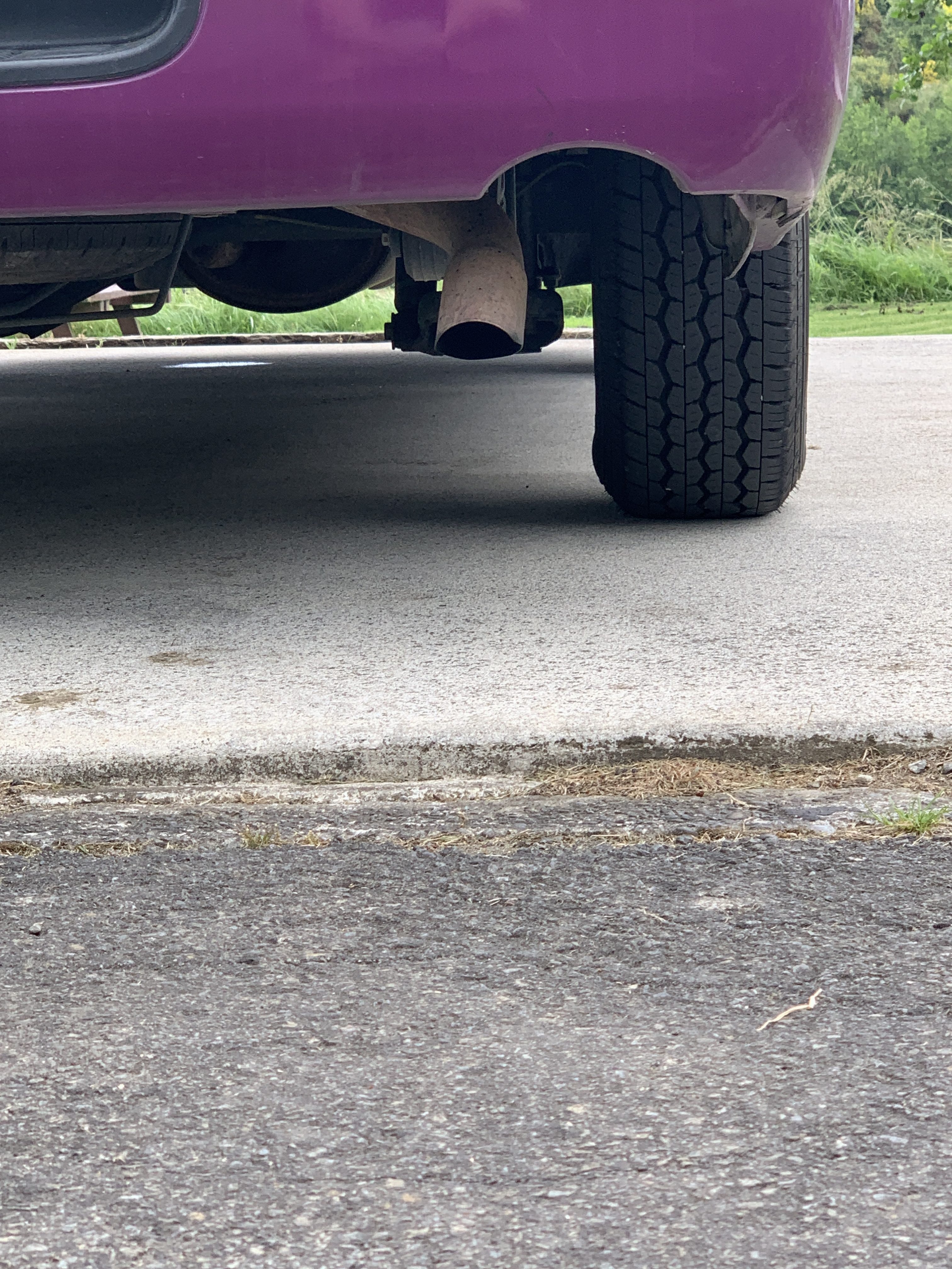 Auf der Weiterfahrt unterhalten wir uns über die Geräusche unseres Vans. Diese sind seit der Übernahme unsere stetigen Begleiter. Es scheint, als ob das Scheppern vom hintersten Auspuffstück kommt. Die laienhafte Expertise nimmt keine gravierenden Mängel wahr, doch erstaunt uns, wo der Auspuff überall an andere Wagenteile „Kontakt“ pflegt. Zudem ragt das Auspuffrohr auch nicht an der vorgesehenen Karosserieeinsparung heraus.